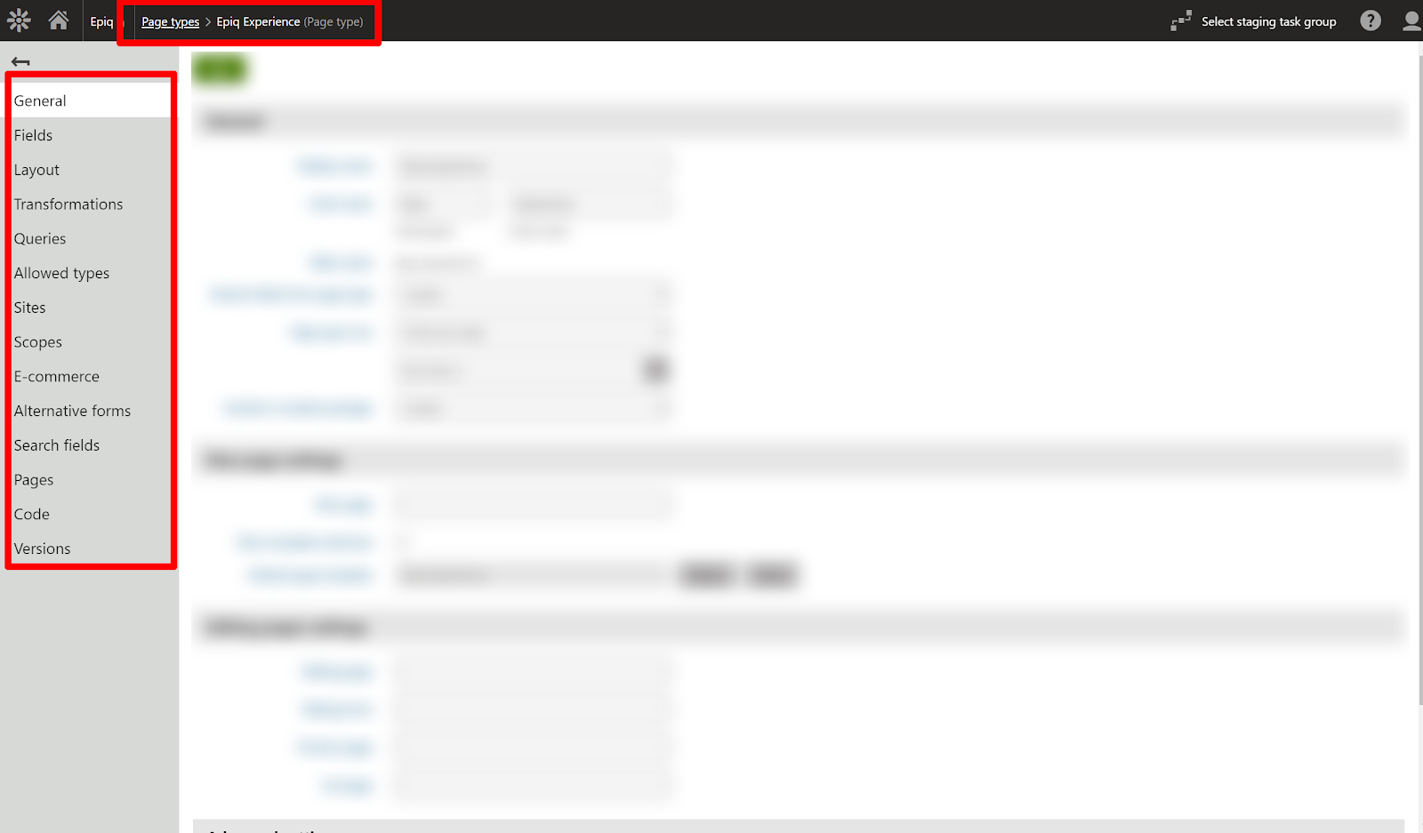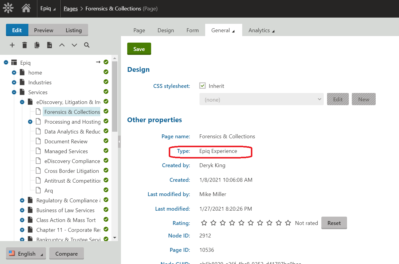When we create a page, we select the Page Type to be “EPIQ Experience” as shown below: