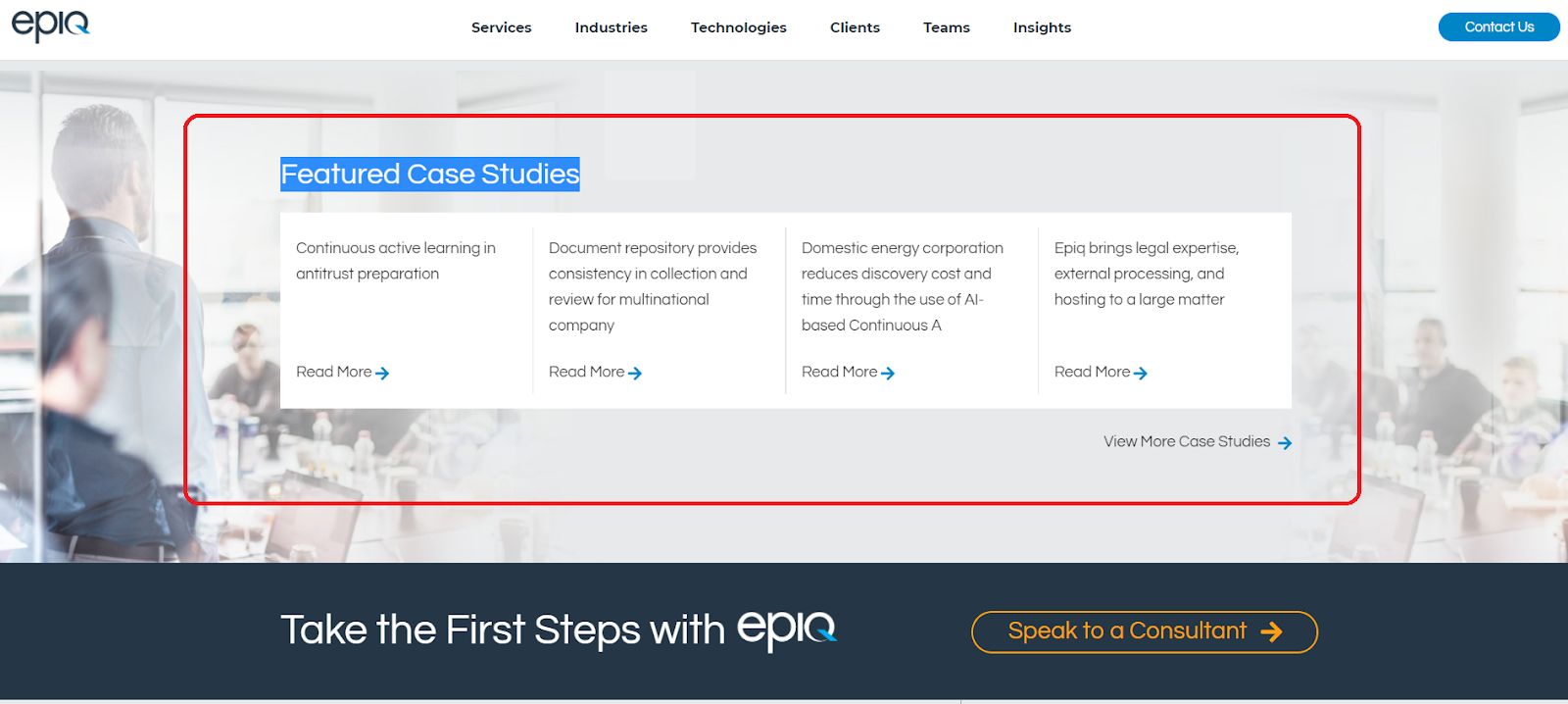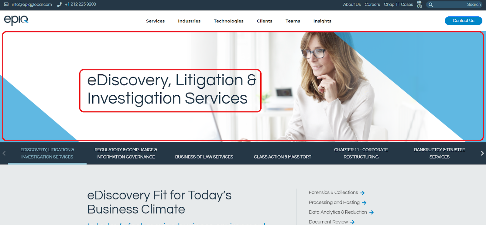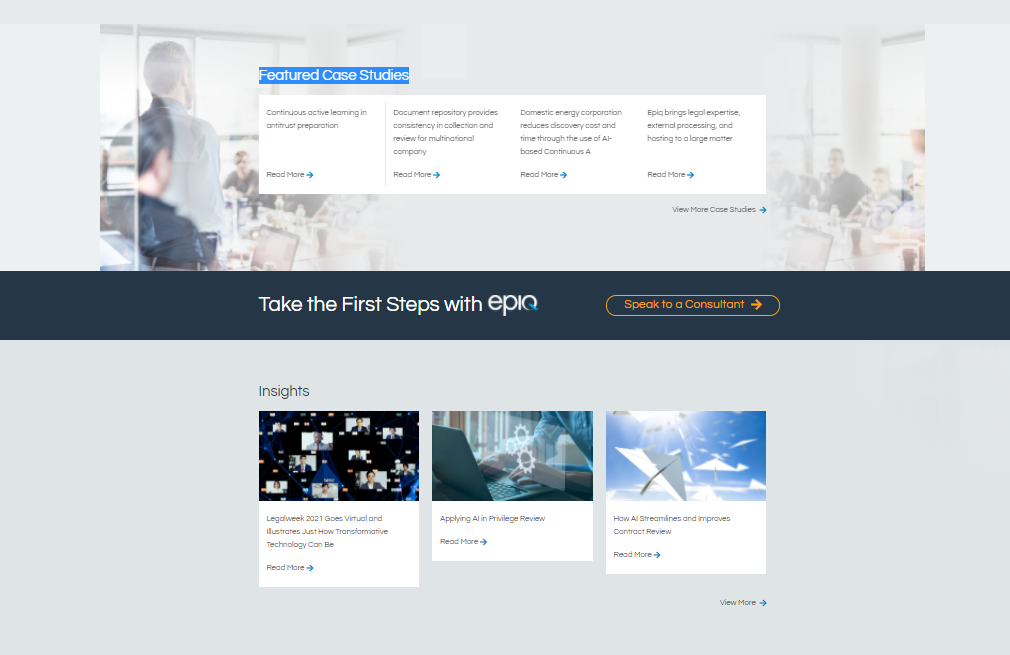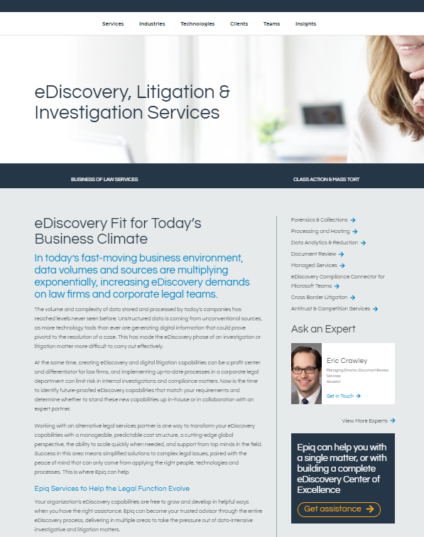 The www.epiqglobal.com website has several pages that describe the company’s services that they offer. Each of these services pages has a specific structure to the content. Specifically, we need to do the following things: