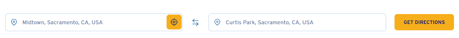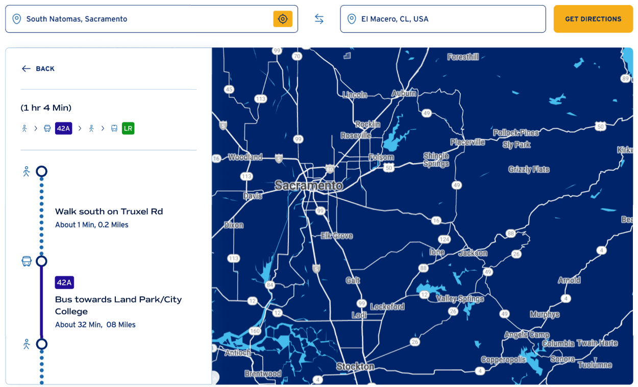 The trip planner allows visitors to select a “from” starting location and a “to” destination location, with dropdown recommendations as they type their locations. Once selected, the stylized map below it, shows the user the exact details of the route to take to reach the destination. On the left side of the trip planner are step by step instructions guiding the user along the route, with icons that provide information like mode of transport ( walking, bus or train ) , distance for each mode, and the total duration of the journey. Here's a snapshot of what it looks like when you want plan a trip from midtown Sacramento to Curtis Park