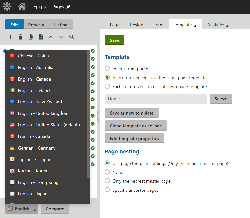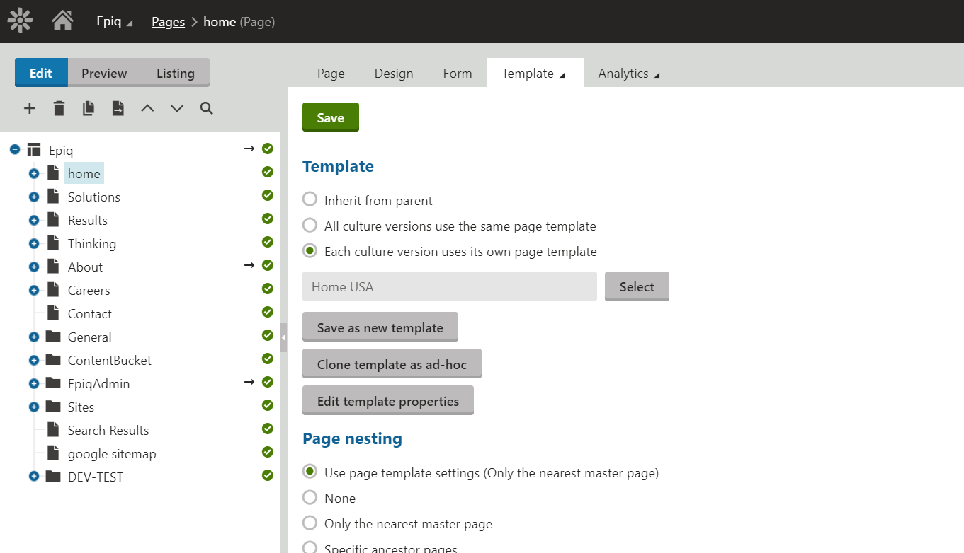 This setting is shared between all versions of the page, so it is not important which language is currently selected when making this change. At this point, we change the template from the “default” to “Home USA” in the English language.