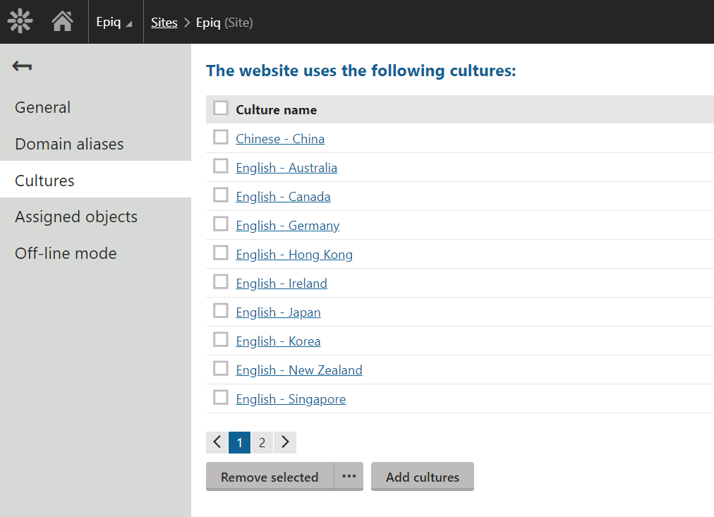 Under the “Cultures” tab in Kentico, you can see all the available cultures. You can also add new cultures. The general structure is that after you set up a culture, you can assign content to that culture and then translate into different languages.