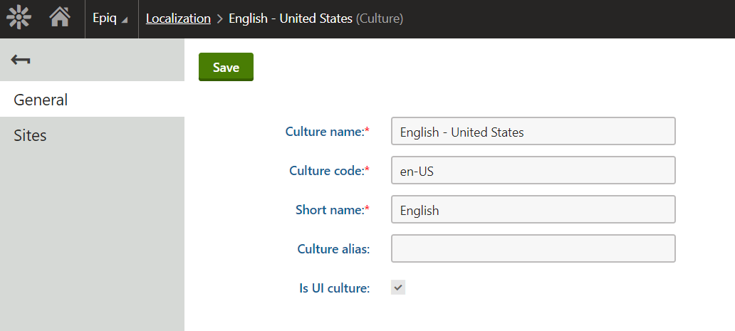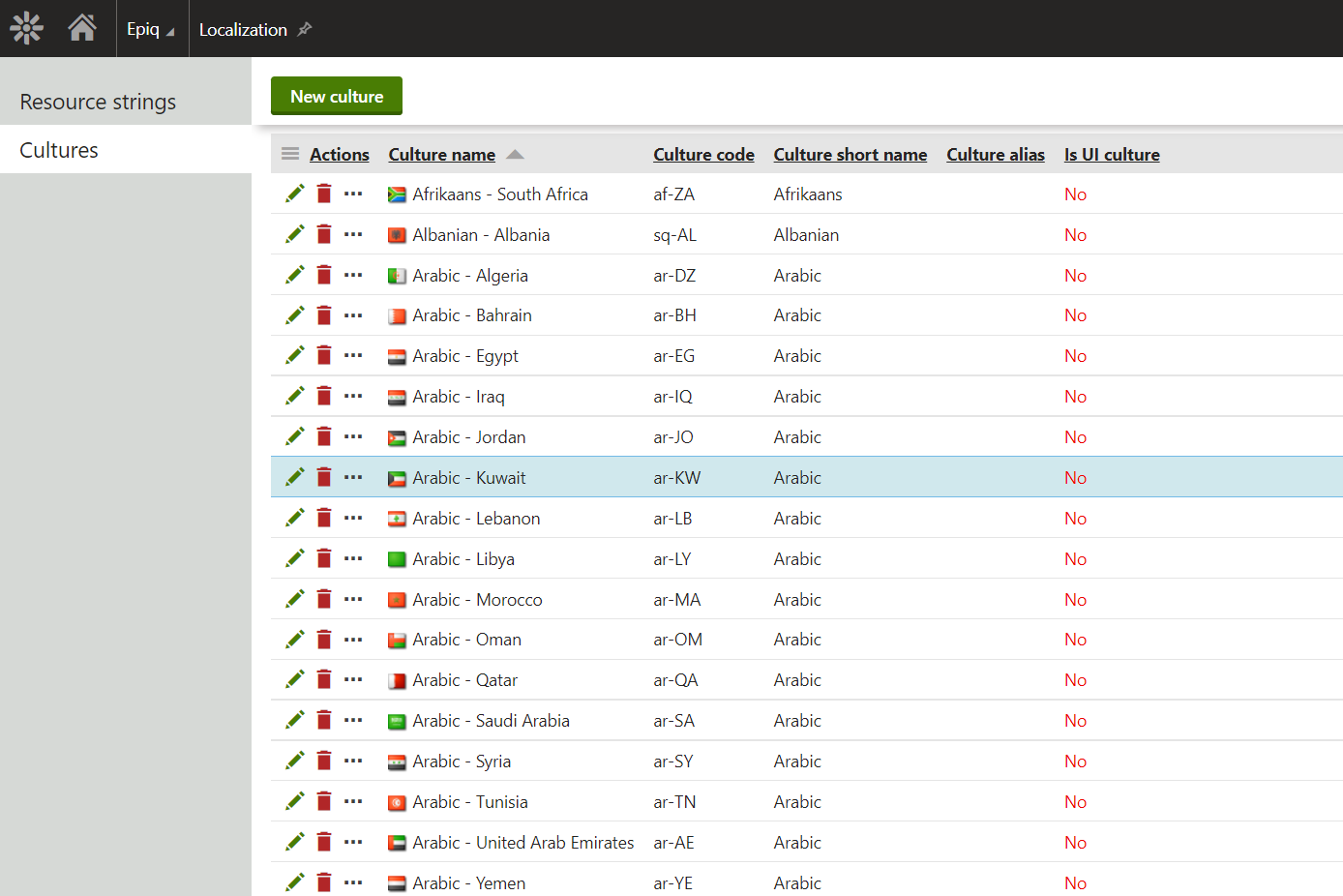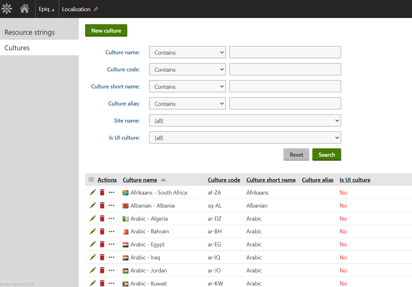 Users with the Global administrator privilege level can manage all cultures in the Localization application on the Cultures tab. To display only UI cultures, choose Yes in the Is UI culture filter and click Search.