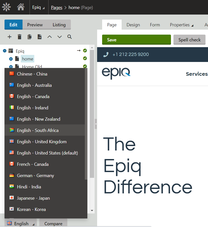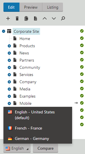 Now in the Pages application, you can see the culture option enabled below the content tree. You can switch to other languages as follows.