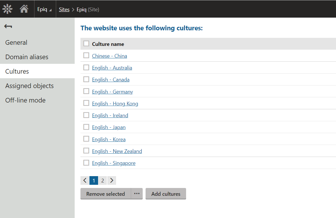 You can find a list of available cultures in the Localization application on the Cultures tab. All major cultures are provided by default. You can assign cultures to websites and translate the content to the respective languages.