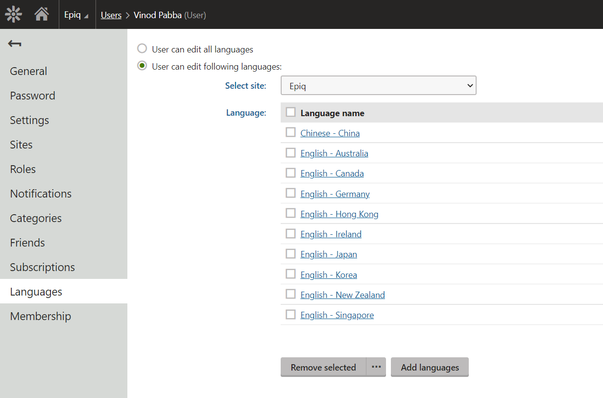 In the Users application, select the user whom you want to control access. In the Language tab click on User can edit the following languages and click on add languages button to select desired cultures. Now the user can able to edit only the selected languages page in the page application.