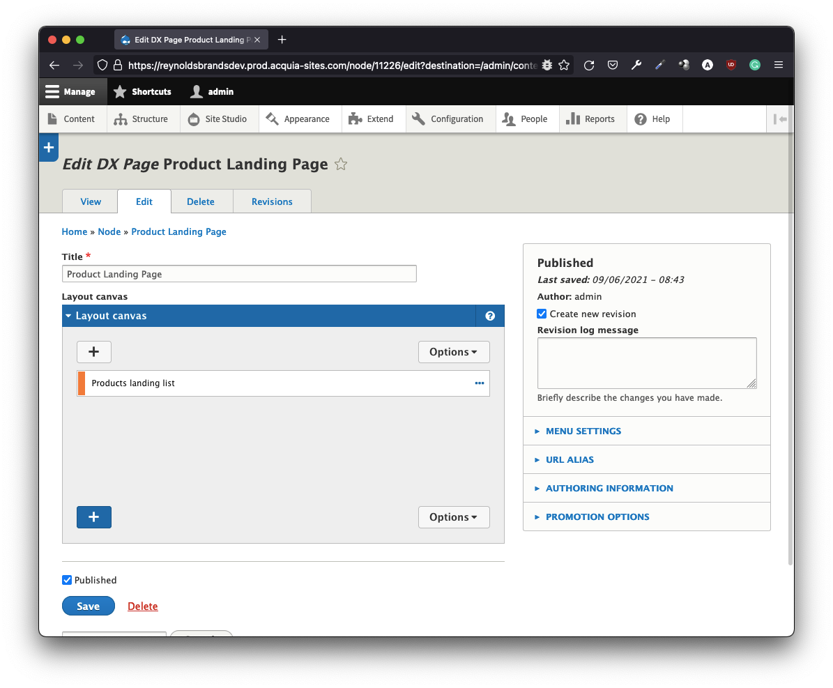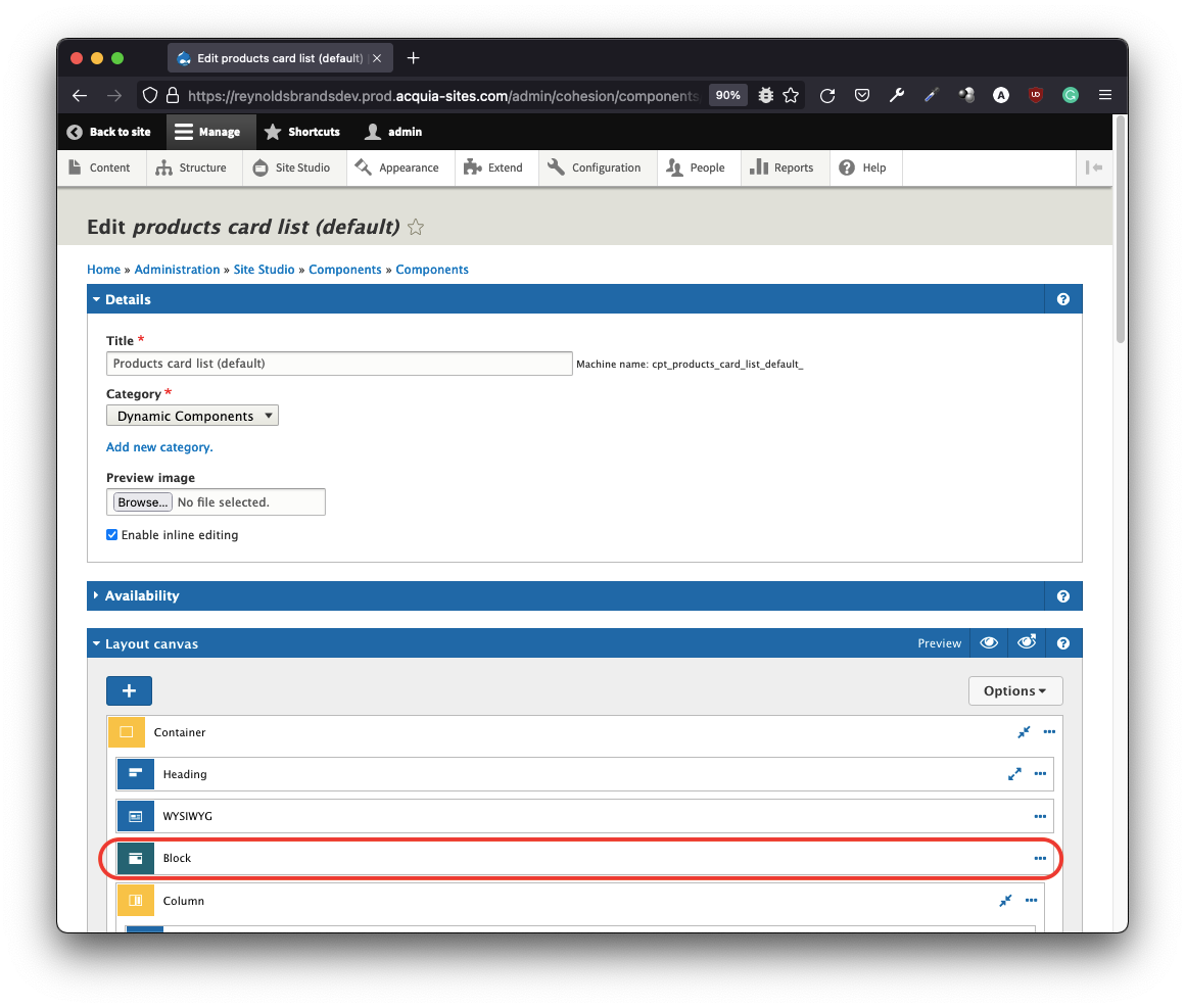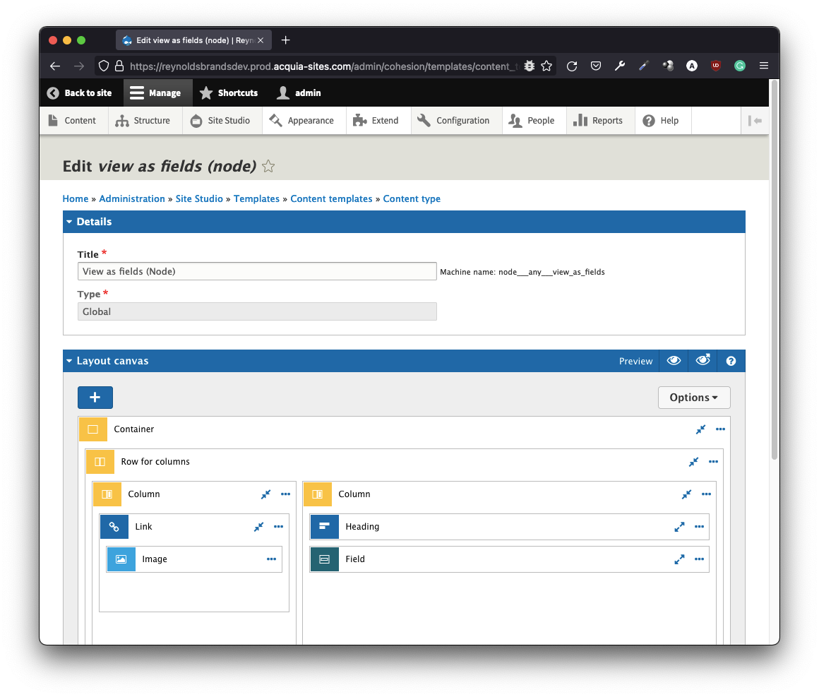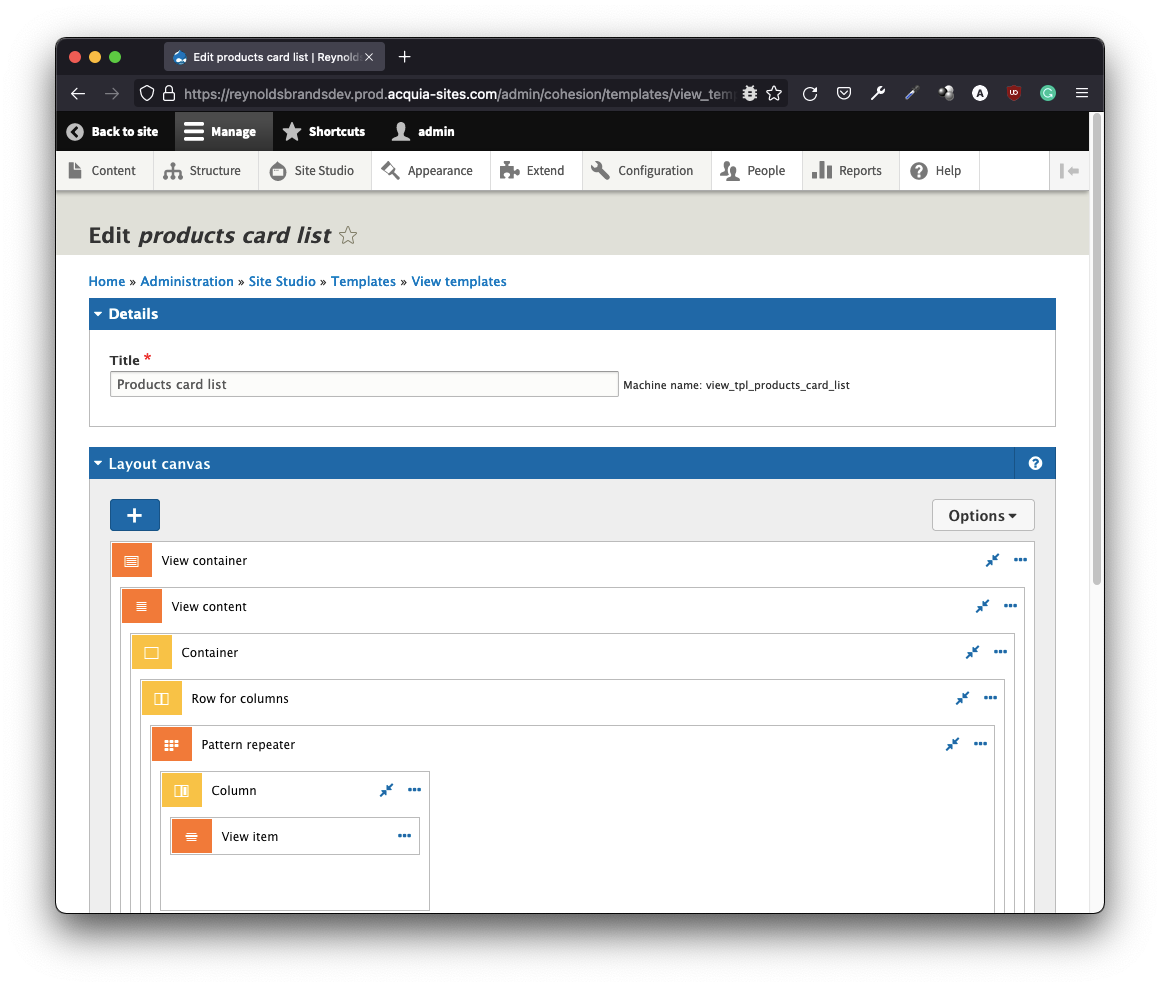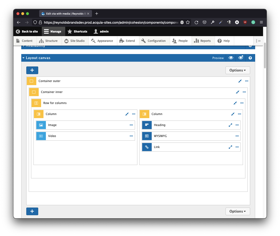 DX8 was rebranded as Site Studio in Acquia - clever marketing roadmap! This acquisition brought all the power and UX of DX8 into the Acquia universe. DX8 (for legacy namesake) was eons ahead in the LC-NC (low-code/no-code) race, knocking out some of the favored visual builders. One of its strongest suits – is the hybrid user interface that’s not fully visual yet expressive in context. Check out this layout canvas interface: