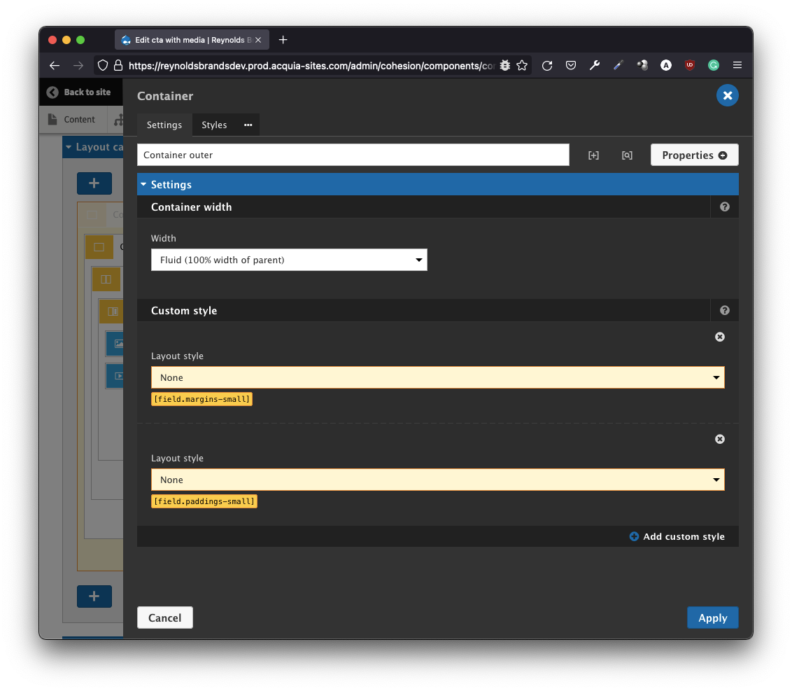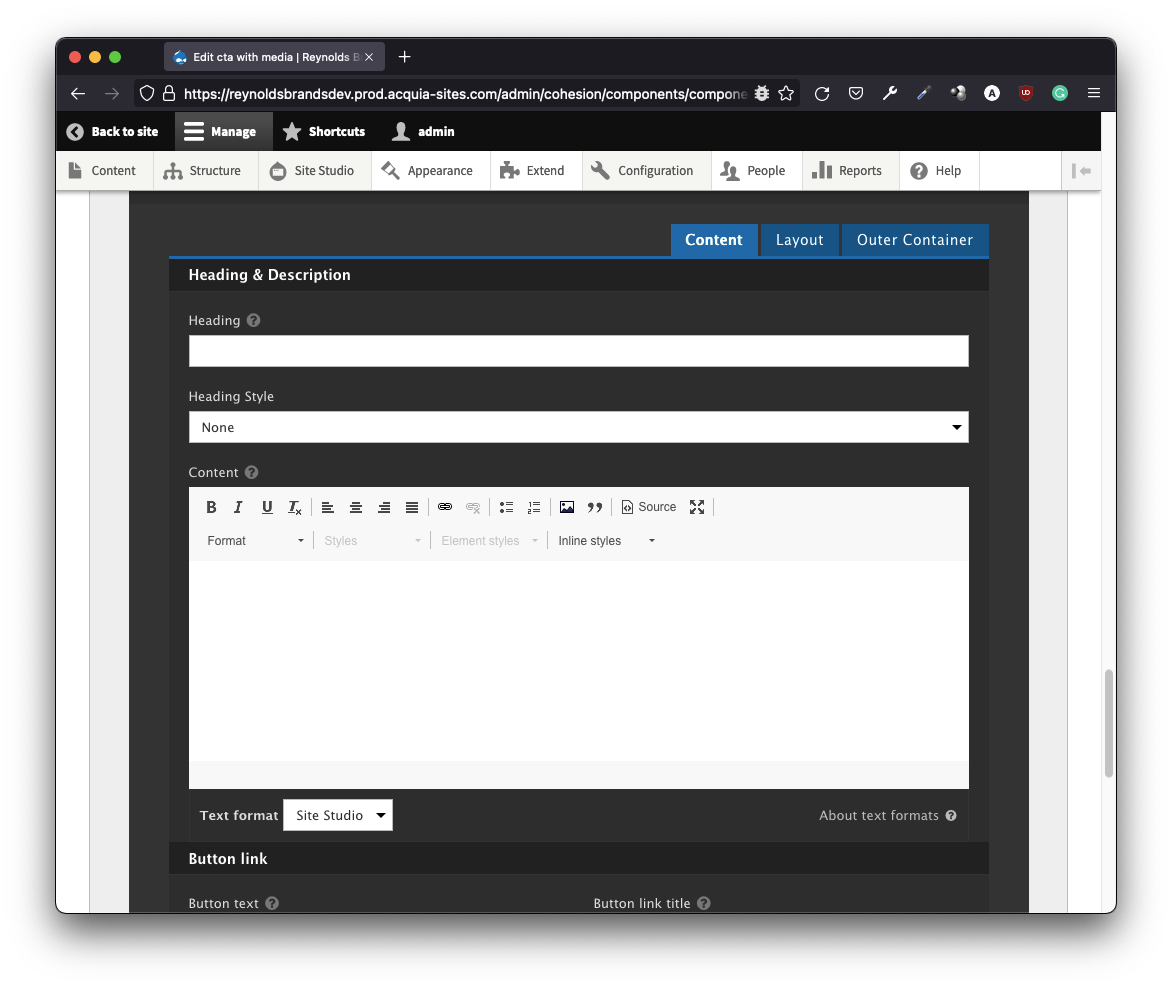 Undoubtedly, Site Studio is a much more sophisticated tool than layout builder. In many test dry-runs, it shined out with flying colors. Site Studio enables a seamless web-based interface to create, configure and style your components – something missing in layout builder out-of-the-box. Building a static component is as easy as: